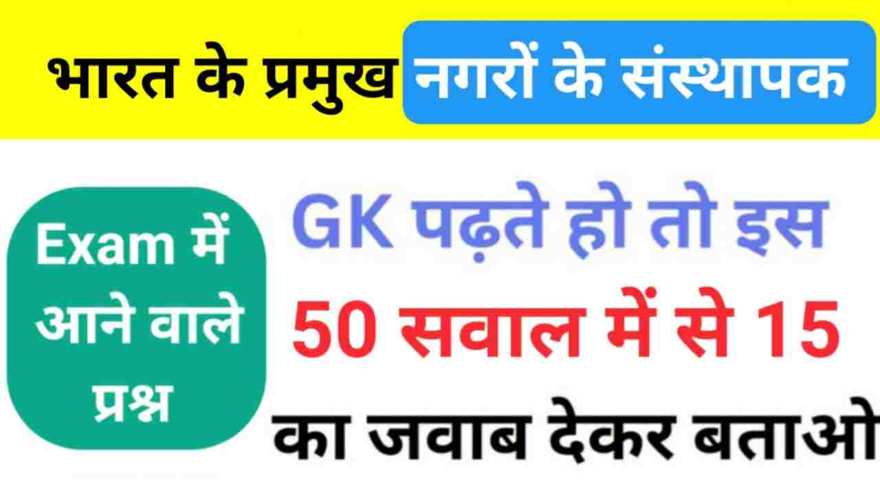 नमस्कार दोस्तों आज में आप सभी के लिए टॉपिक वाइज गक के महत्वपूर्ण प्रश्न ले के आया हु ये सभी प्रश्न महत्वपूर्ण प्रश्न ले के आया हु जैसा की आप सभी को पता हे अगर आप भी SSC GD, RRB, NTPC, BANK या किसी और प्रतियोगि परीक्षा की तयारी कर रहे हो तो भारत के प्रमुख नगरों के संस्थापक से सम्बंधित प्रश्न महत्वपूर्ण है इसलिए आज में आप सभी के लिए चुनिंदा प्रश्नो को ले कर आया हु और हां आप सभी को ये सभी प्रश्न आसानी से याद हो जाय इसलिए मेने आप सभी के लिए ऑनलाइन टेस्ट भी दिया है |